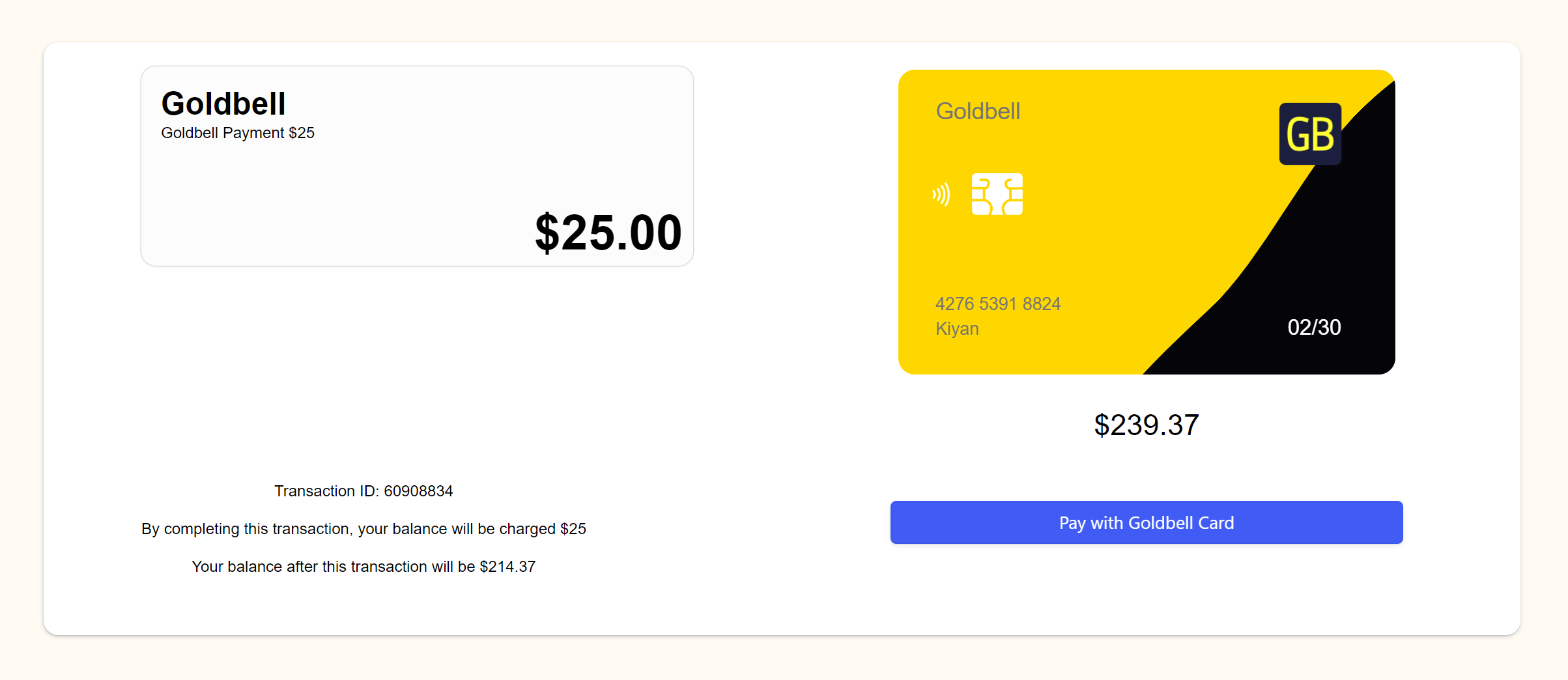 - RECIPIENT (site): Write code to add the newly generated transaction ID from the startpayment endpoint after 'https://goldbell.kiyan.site/pay/?id='. After that, you can add '&destination=[the page you would like the user to be redirected back to]'. This way, after the user completes the payment, they will be redirect back to your desired page. The destination parameter is optional. If it is not specified, the user will see 'You can close this tab now.'